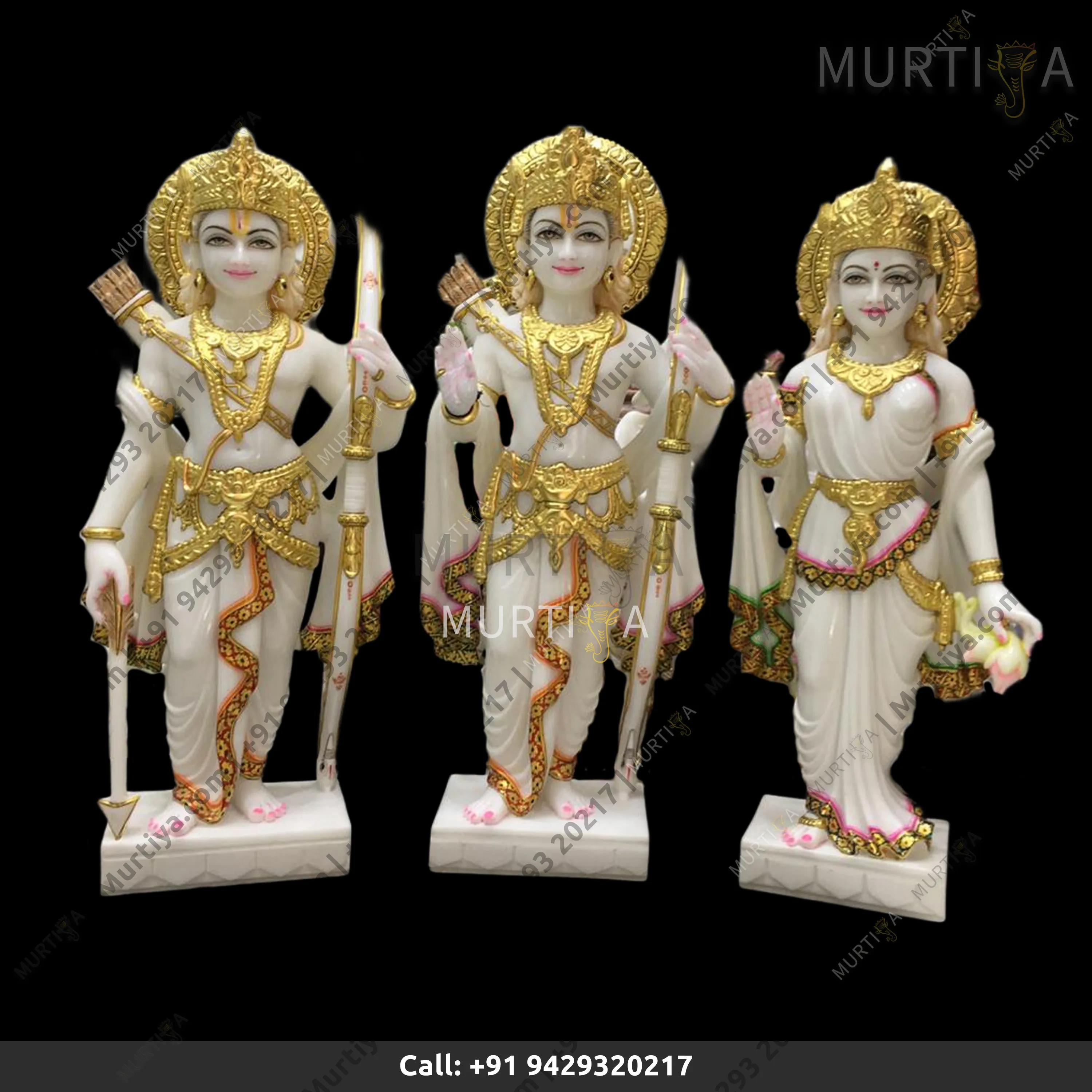 Pure white Makrana Marble Ram-Laxman-Sita idol, 12–24 inch, square base, golden outline. Made to order—shop at Murtiya.