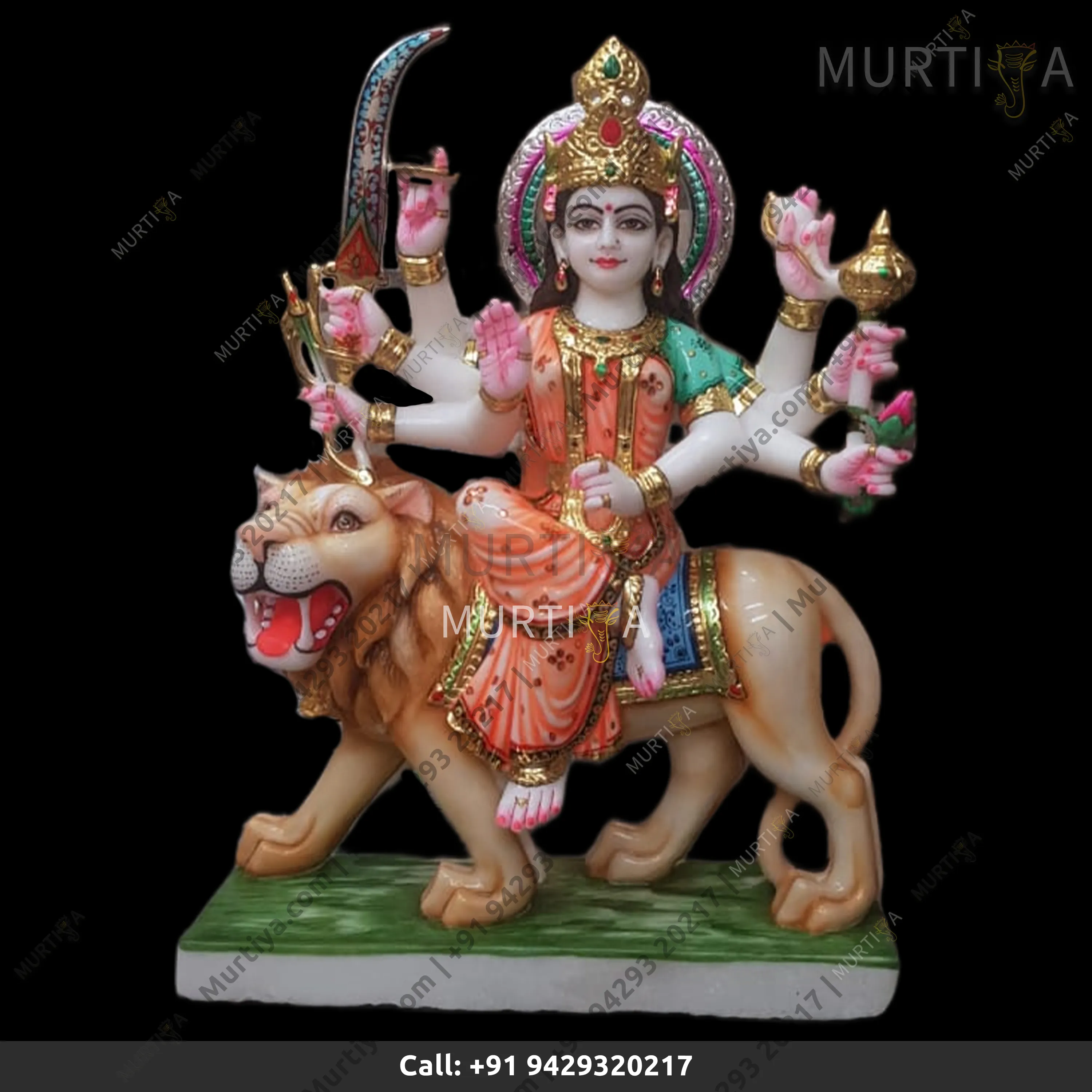 This Durga Maa statue is carved from Makrana marble (Makrana, Rajasthan, India), a well-known Indian marble used in traditional temple-grade carving. The idol is Made to Order, allowing careful finishing of the saree colors and the lion’s expressive, protective posture.
