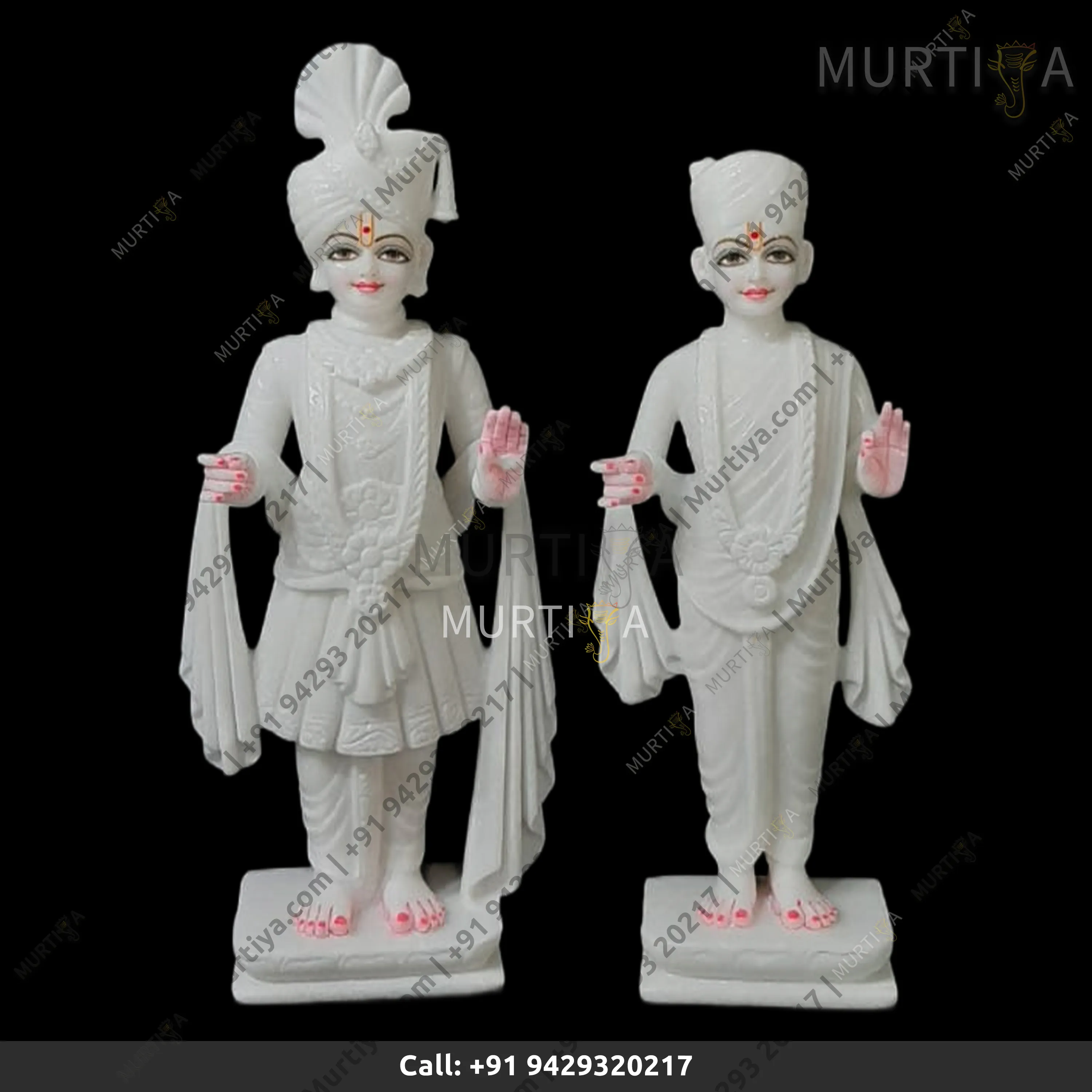 Pure Marble Akshar Purushottam and Gunitanand Swami pure white on lotus base is a handcrafted devotional murti set for home mandir or temple installation, carved from Makrana marble (Rajasthan, India), known for its naturally bright white tone and fine grain. The sacred pair—Akshar Purushottam and Gunitanand Swami—is seated on a detailed Lotus pedestal, a traditional symbol of purity and spiritual elevation. This is a Made to Order statue, finished by artisans for consistent symmetry and clean carving lines.